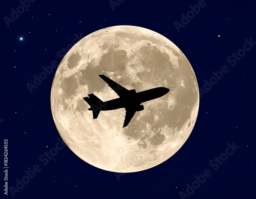 © Mah, Naklejka premium A dark silhouette of a passenger aircraft flies across the moonlit sky, with the full moon serving as a backdrop. Stars dot the dark blue