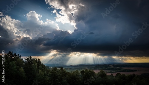 © Kath, Fototapeta premium a dark sky with clouds and sunbeams