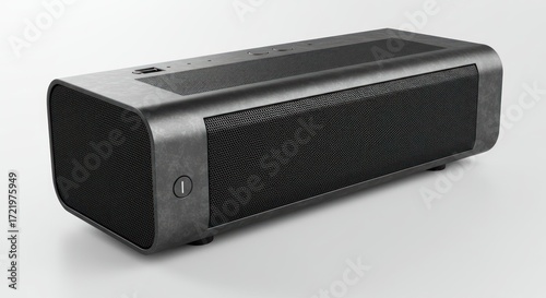 Fototapeta premium A dark textured speaker sits on a white surface
