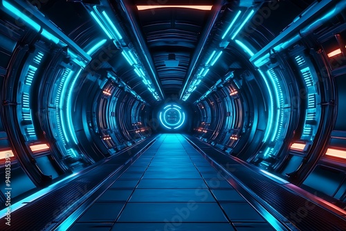Fototapeta premium A dark tunnel environment illuminated by laser lights, featuring metal...