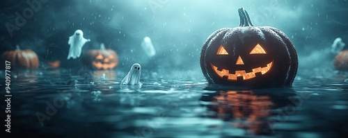 Fototapeta premium A dark underwater cavern is illuminated by glowing pumpkins and ghostly figures floating through the water, creating a haunting Halloween atmosphere. The scene provides plenty of copy space for text