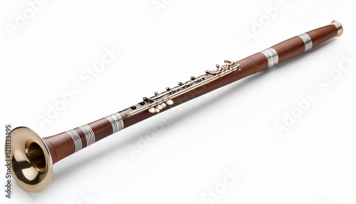 © art, Fototapeta premium A dark wood clarinet with brass and silver accents rests on a white background.
