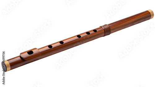 © ikhsan, Naklejka premium A dark wood flute with gold accents and circular finger holes against a black background
