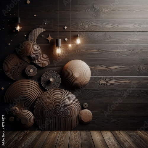 © Владимир Стеблев, Fototapeta premium A dark wood wall with a wooden background with a few small circles on the bottom