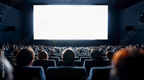 © Atchariya63, Fototapeta premium A darkened movie theater with an empty screen and an audience eagerly awaiting the show.