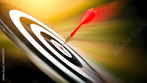 © Namhom, Obraz premium A dart hitting the bullseye on a professional dartboard, with motion blur