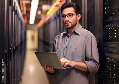 © Dzenka, Fototapeta premium A data center chief in a server room looking at a laptop computer. Ai generated.