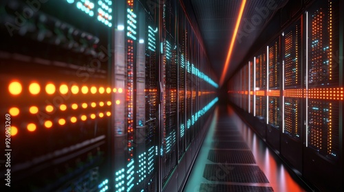 © keetazalay, Fototapeta premium A data center filled with rows of servers blinking lights indicating data processing AI systems managing and optimizing the infrastructure