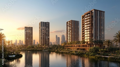 Obraz premium A daytime landscape shows modern architectural towers against a clear sky,...