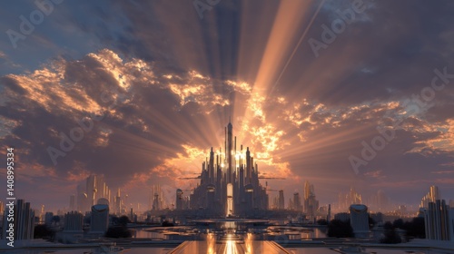 Fototapeta premium A Dazzling Art Deco Style Future Metropolis at Sunset: Striking Sunburst...