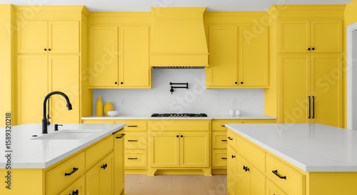 © DH, Fototapeta premium A dazzling monochromatic yellow kitchen, showcasing sunny cabinets, pristine white quartz countertops, and stylish black hardware, creating a vibrant and inviting space, perfect for 'The Funky