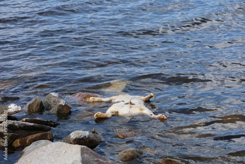 © Uliana, Fototapeta premium A dead raccoon floats in Wascana Lake, Regina, Saskatchewan.