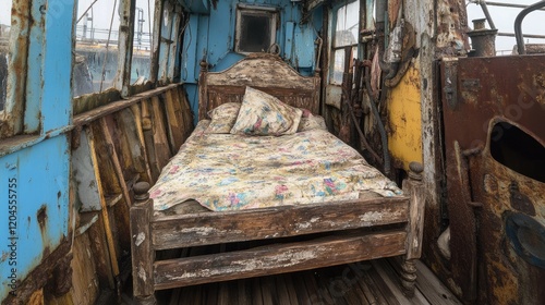 © Pannee, Obraz premium A decayed wooden bed frame on the deck of a derelict ship, surrounded by rusting metal