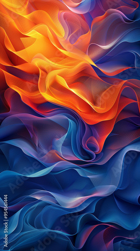 © RUK Collections, Obraz premium A deconstructed abstract vector pattern with intertwined curves and waves in a gradient of cool blues and warm oranges, creating a dynamic contrast.