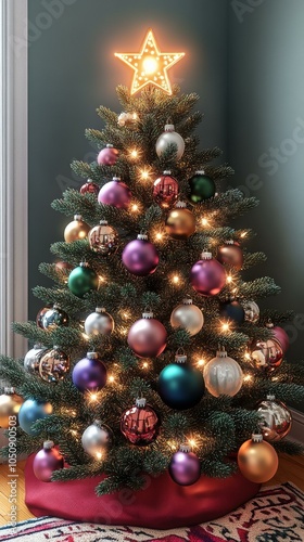 Fototapeta premium A decorated Christmas tree adorned with colorful ornaments and twinkling...