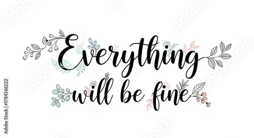 © habib, Naklejka premium A decorative and elegant handwritten style quote saying 'Everything will be fine' surrounded by delicate floral illustrations for positive reassurance and motivation