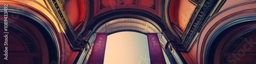© Lila Patel, Obraz premium A decorative archway framed by two banners, one hanging above and one below, wide-angle view.