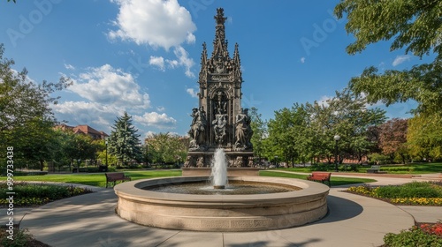 Fototapeta premium A decorative fountain surrounded by greenery and benches in a park setting.