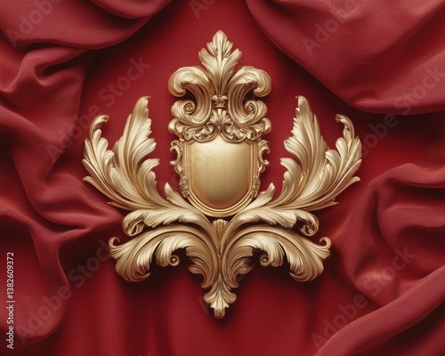 © Ant, Fototapeta premium A decorative golden crest set against rich red fabric, featuring intricate leaf patterns and an ornate shield design.