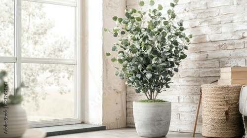 Fototapeta premium A decorative indoor space featuring a potted eucalyptus plant in the corner,...