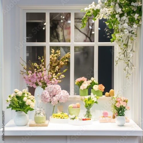 © Fotograf, Fototapeta premium A decorative table setting with vases filled with flowers