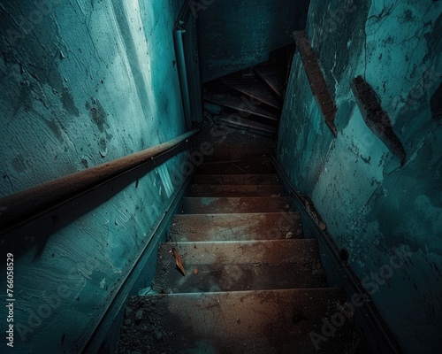 © AI Farm, Obraz premium A decrepit staircase leading down to a dark unknown basement