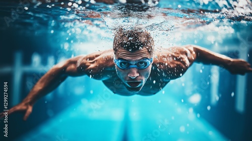 Fototapeta premium A dedicated athlete propels himself forward underwater, showcasing powerful...