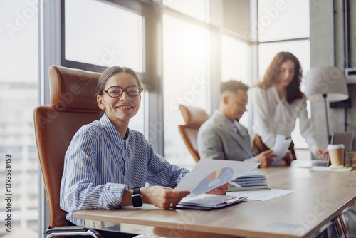 © Yaroslav Astakhov, Obraz premium A dedicated team is engaged in a meaningful and productive discussion in a bright, modern office environment