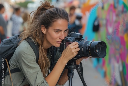 © Milos, Naklejka premium A dedicated woman photographer adjusts her camera on a tripod capturing the essence of an outdoor art scene. Her focus and commitment to her craft are evident.