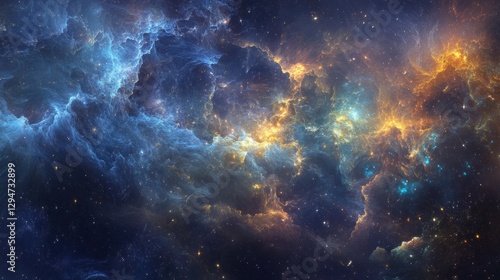 © Roma, Fototapeta premium A deep blue nebula with swirling patterns and patches of orange and yellow.