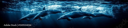 Naklejka premium A deep blue ocean with a pod of dolphins swimming in synchronized motion....