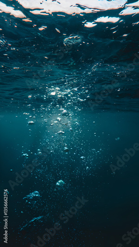 © Faraz-9461894, Obraz premium A deep blue underwater background with floating bubbles.