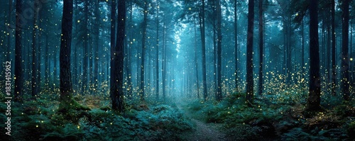 © Thamonchanok, Obraz premium A deep forest with ghostly forms at dusk concept. Mystical forest with glowing lights and serene ambiance at dusk.