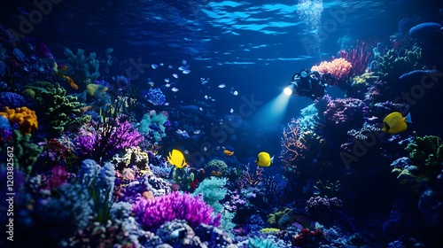 Fototapeta premium A deep-sea diver exploring a coral reef holding a flashlight surrounded by colorful marine life.