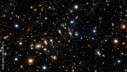 © Hamzi, Fototapeta premium A deep-space image showcasing numerous galaxies of varying sizes, colors, and brightness against a backdrop of countless stars, exhibiting a diverse cosmic landscape