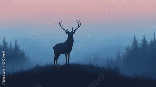 Fototapeta premium A Deer Standing on a Misty Forest Overlook with Cool Tones
