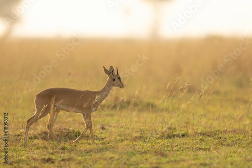 © Jan556/Wirestock Creators, Obraz premium a deer standing on top of a lush green field next to trees