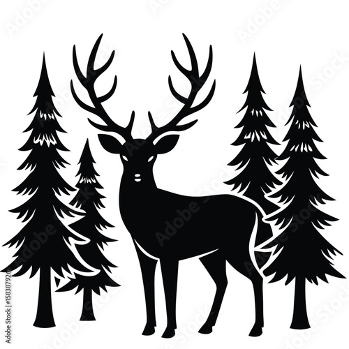 © fahim, Obraz premium a deer standing quietly among stylized forest trees, with antlers raised and calm posture, minimalist vector illustration isolated on white background