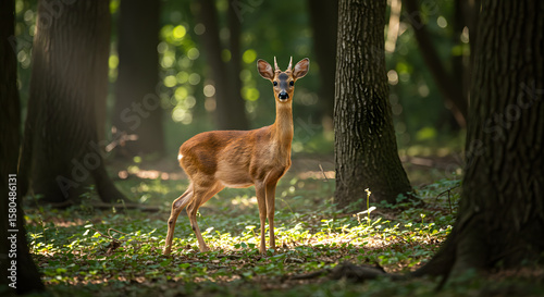 © Tawandaeng, Fototapeta premium A deer stands among trees in a sunlit forest clearing.