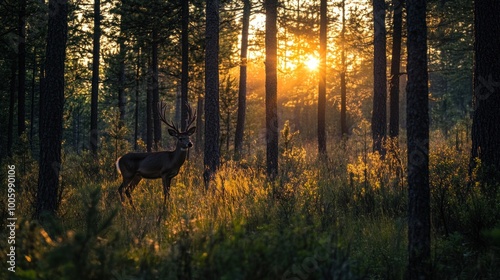 © BerkahStock, Fototapeta premium A deer stands in a sunlit forest, surrounded by trees and golden light.