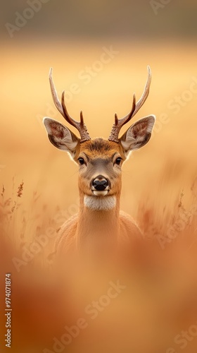 © Mikus, Fototapeta premium A deer with antlers, its face filling the frame, against a backdrop of lush grass in the background