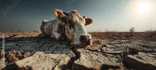Fototapeta premium A dehydrated cow lies on severely cracked, dry earth under a harsh, bright sun, symbolizing drought