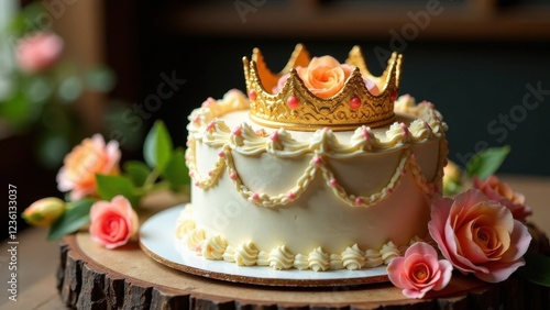 © Angel Pic, Fototapeta premium A delectable vanilla cake, adorned with delicate pink frosting and a golden crown, rests on a rustic wooden pedestal, surrounded by soft pink roses.
