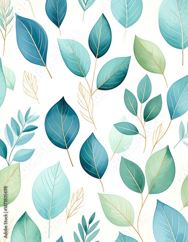 © Tengok, Obraz premium A delicate and vibrant repeating pattern of various leaves in teal, mint green, and pale gold hues, set against a crisp white background.