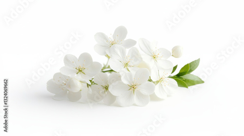 © Bunny creation, Obraz premium A delicate arrangement of fresh white flowers with green leaves on a white background. isolated on white background.