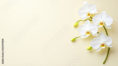 © Thanawat, Obraz premium A delicate arrangement of white orchids against a soft yellow background, exuding elegance and tranquility.