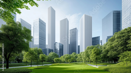 © wipawan, Obraz premium A delicate balance between the urban and the natural, as towering skyscrapers are embraced by lush greenery,Harmonious,Metropolis.