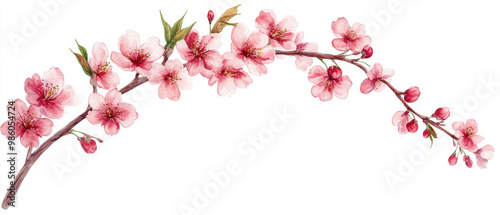 © Bunny creation, Naklejka premium A delicate branch of cherry blossoms showcasing soft pink petals and vibrant green leaves, perfect for nature-themed designs.
