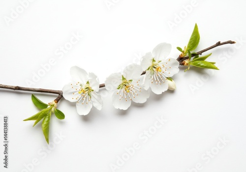 © Muaz, Obraz premium A delicate branch with white blossoms and green leaves against a plain white background studio shot