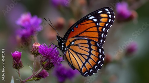 Fototapeta premium A delicate butterfly with orange and black wings feeding on a vibrant purple...